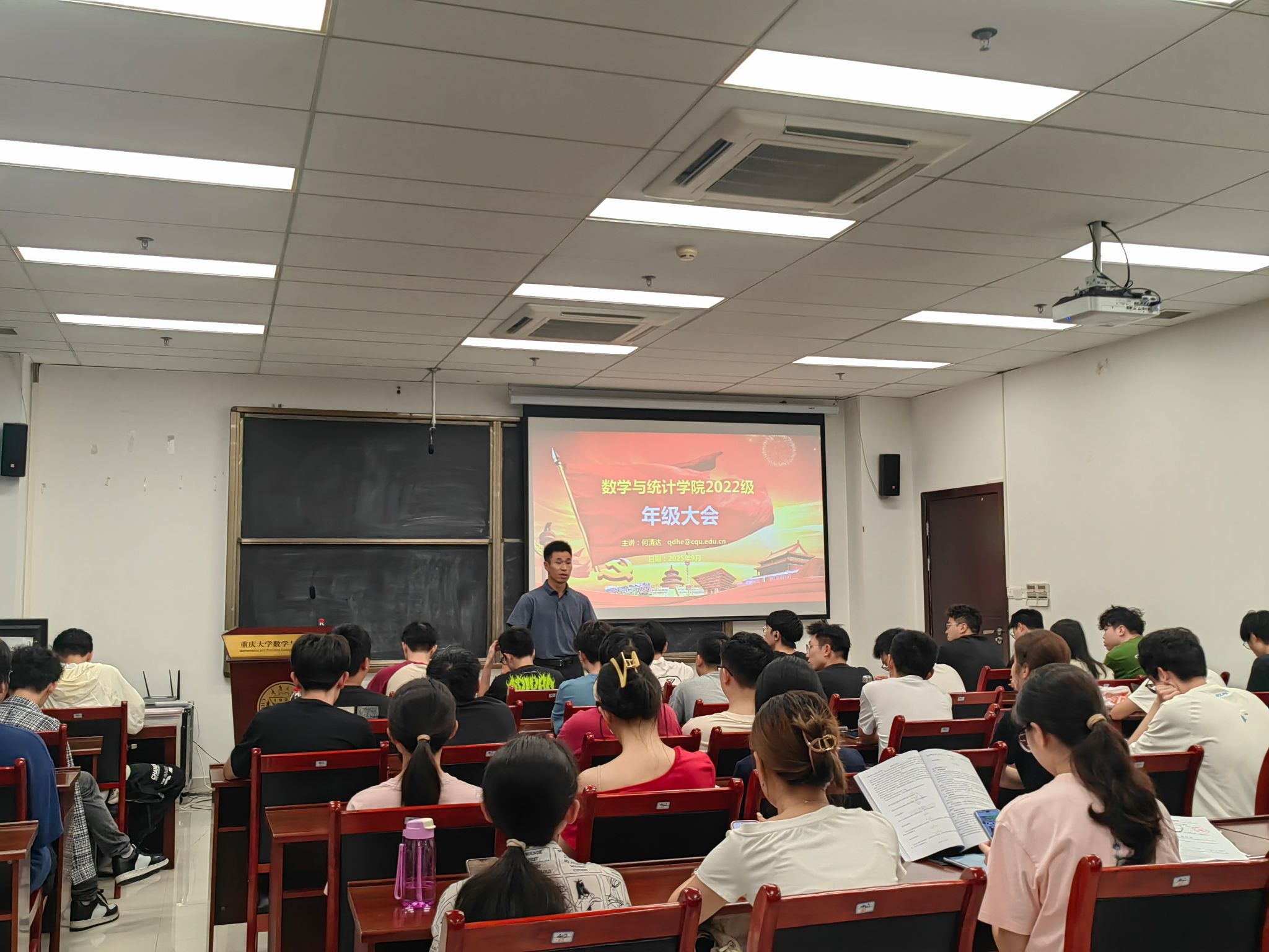 2025年9月15日,重庆大学数学与统计学院2026届毕业生就业动员会暨年级大会在科学城校区理科楼LD402举行。会议由学院党委副书记、纪委书记、年级辅导员何清达主持,2022级全体本科生参加。